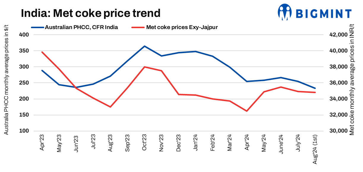 Imported met coke price indications were heard to have fallen by INR 3,000-5,000/t versus domestic coke. However, due to the wait for a concrete decision on import restrictions, fresh deals were not heard. An inter-ministerial meeting was scheduled for 15 July, 2024, to discuss the safeguard recommendations proposed by the Directorate General of Trade Remedies (DGTR) on imports of low-ash met coke. Organised by the Ministry of Commerce and Industry with other stakeholders, the meeting aimed to address potential import restrictions.