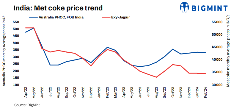 Indian met coke prices have been recorded at INR 34,000-35,000/tonne (t) ex-Jajpur this week. Prices remained unchanged w-o-w due to sustained better import offers and reduced purchasing activity. Imported prices continued to yield more favourable returns compared to domestic materials.