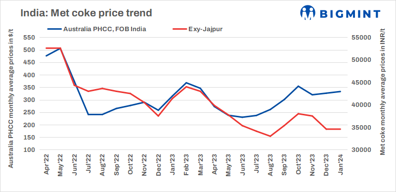 Indian met coke prices stood at INR 34,000-35,000/tonne (t) ex-Jajpur, eastern India, this week. Prices remained largely unchanged w-o-w due to better import offers, coupled with reduced buying activity. Imported coke prices continue to provide better realisations compared to domestic material.