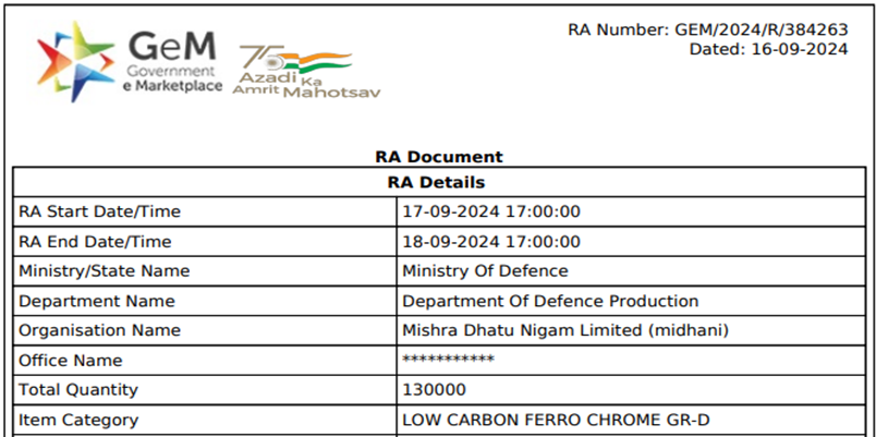 Mishra Dhatu Nigam Limited (MIDHANI) has concluded a reverse auction for 130 t of low-carbon (LC) ferro chrome (C: 60% min, 25-100 mm) for its Hyderabad-based unit on 18 Sep’24. The entire material was booked with the L1 price at INR 219,500/t FOR (excluding GST and GEM portal charges), as per sources.
