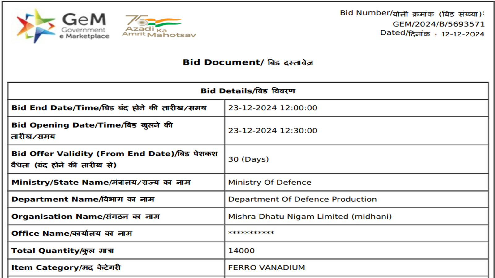 Mishra Dhatu Nigam Limited (MIDHANI) has floated a purchase tender for 14 t of ferro vanadium (V:50-65%, size: 10-50 mm) for its Hyderabad-based unit. The last date for submission of bids is 23 Dec’24. The bid offer is valid for 30 days from the end date.