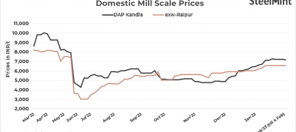 - Mill scale (Fe 68-70%) prices decreased marginally by INR 50/t to INR 7,150/t DAP Kandla on 4 Feb’23 compared to INR 7,200/t on 1 Feb. No deal was recorded in this period of time.