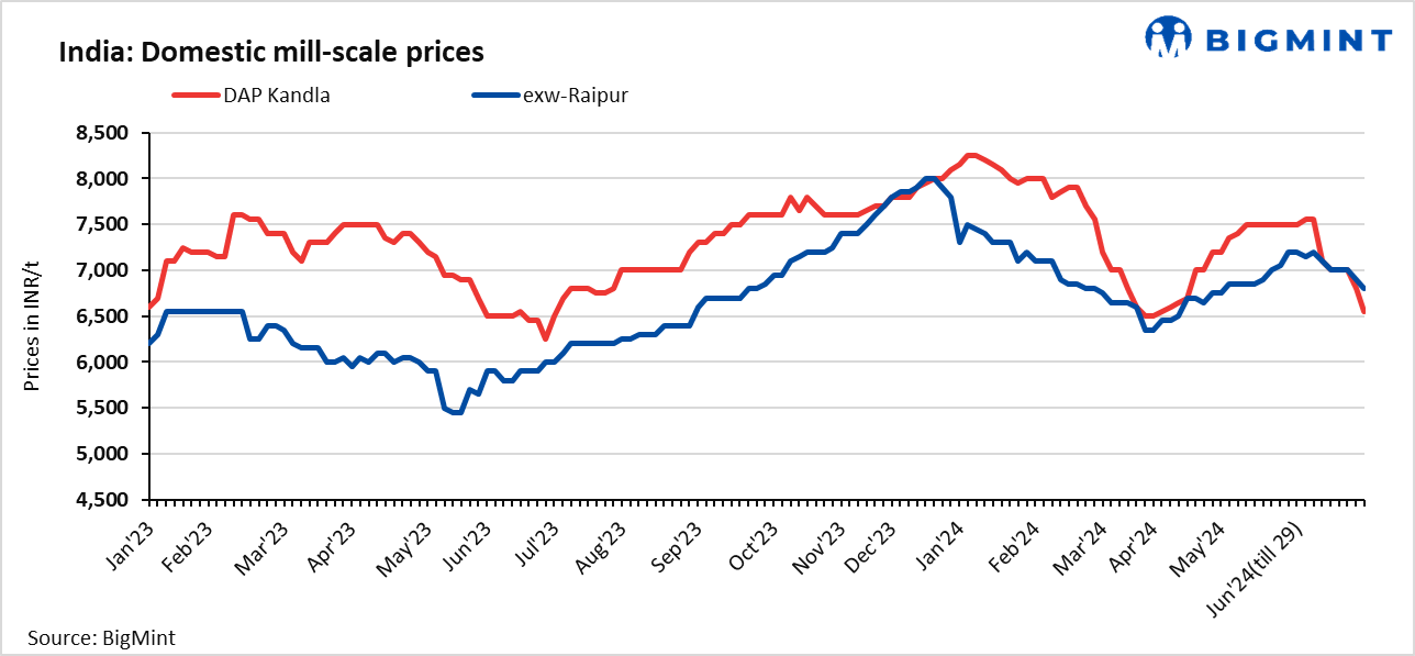 • Meanwhile, mill scale prices in Raipur fell by INR 100/t to INR 6,800/t exw on 29 Jun’24. Lower bids on falling pellet offers and absence of trading activities amid bid-offer disparities have pressurised mill scale prices in the region.