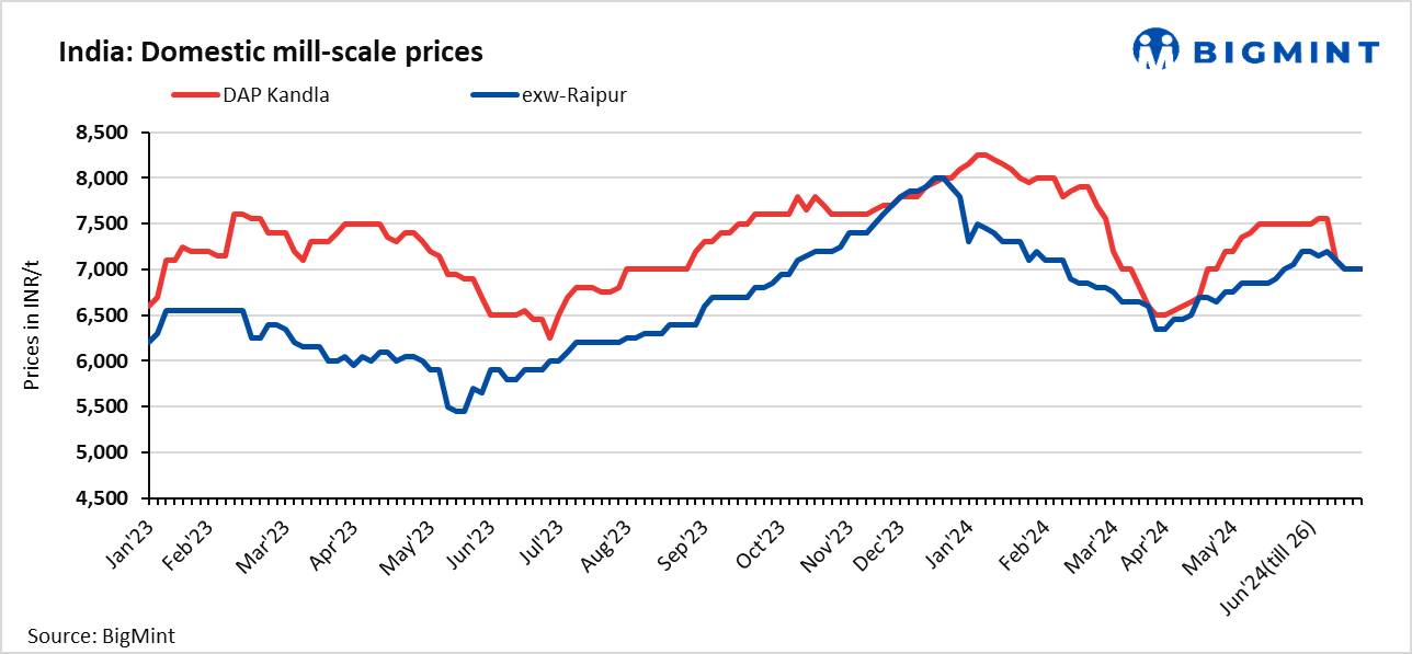 - Meanwhile, mill scale prices in Raipur fell by INR 100/t to INR 6,900/t exw on 26 Jun’24. Absence of trading activities was seen due to lack of buying interest.