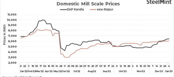 - Mill scale (Fe 68-70%) prices stand at INR 6,450/t DAP Kandla, inching up by INR 50/t from INR 6,400/t on 31 Dec’22. Around 3,800 t of deals were concluded at INR 6,500/t DAP Kandla during this period.