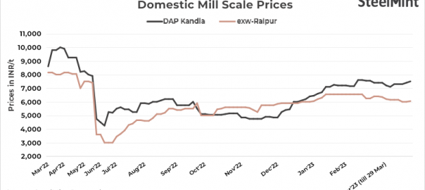 - Mill scale (Fe 68-70%) prices inched up INR 100/t to INR 7,500/t DAP Kandla on 29 Mar’23 against 25 Mar levels. Around 5,000 t deals were recorded at INR 7,500/t DAP Kandla in this publishing window.