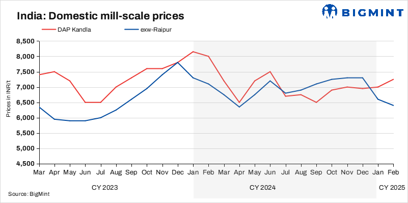 • Prices in Raipur decreased by INR 100/t to INR 6,100/t exw today against 12 Feb. Around 950 t deals were recorded. Lower bids, absence of key buyers weighed on prices.
