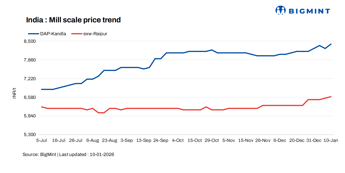 Mill scale prices strengthened in both Kandla and Raipur on 10 Jan’26 against 6 Jan.