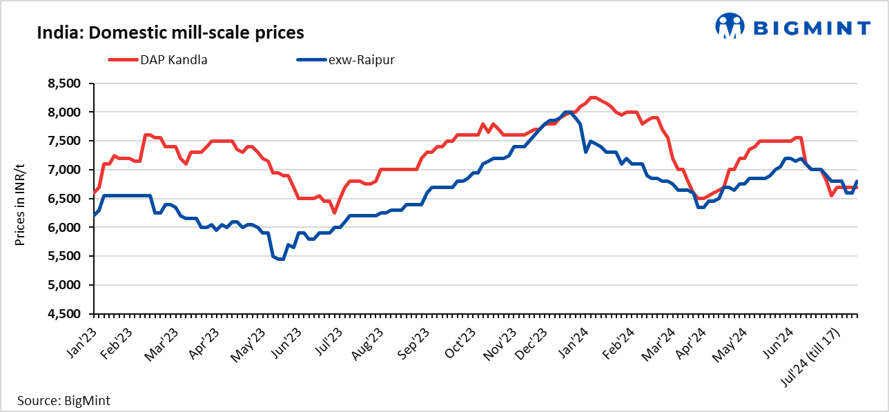 - Mill scale prices in Raipur rose by INR 200/t to INR 6,800/t exw on 17 Jul’24 against 13 Jul. Around 2,000 t of mill scale deals were recorded at INR 6,800-7,100/t exw Raipur. Improved trades on lower inventories have pushed mill scale prices at higher levels in the region.