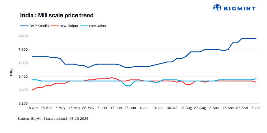 - Raipur: Prices edged down by INR 50/t to INR 6,150/t exw against 4 Oct; 600 t booked at INR 6,100-6,150/t.