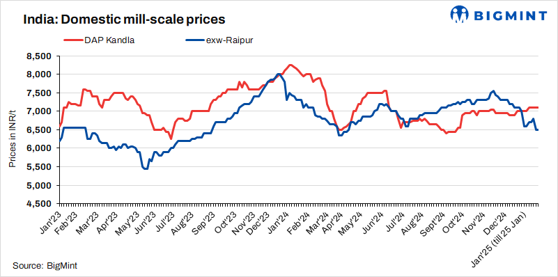 • Raipur prices are stable at INR 6,500/t exw today against 22 Jan. Around 1,600 t were sold at INR 6,500-6,700/t exw Raipur. Lack of demand weighed on mill scale prices.
