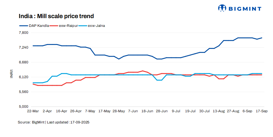 - Raipur: Prices held at INR 6,200/t exw against 13 Sep; 2,200 t were booked at INR 6,000-6,300/t.