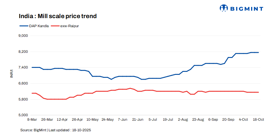 - Raipur: Prices stood stable at INR 6,150/t exw, with 1,060 t traded at INR 6,150/t exw-Raipur. Buying activity was weak amid the festive mood.