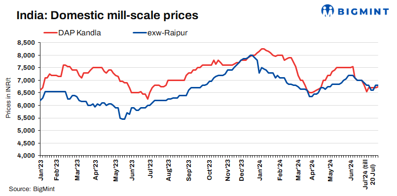 - Mill scale prices in Raipur remain supported at INR 6,800/t exw on 20 Jul’24 against 17 Jul. Around 6,000 t of mill scale deals were recorded at INR 6,700-7,000/t exw Raipur.