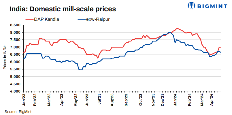 • Prices in Raipur remained largely stable at INR 6,650/t exw. Deals of 1,200 t mill scale concluded at INR 6,800-6,900/t exw Raipur.