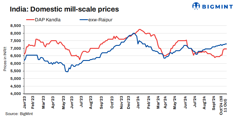 - Mill scale prices in Kandla remained stable at INR 6,950/t DAP on 11 Oct’24 against 9 Oct. Deals of 2,550 t of mill scale were recorded at INR 6,950-7,050/t DAP Kandla.