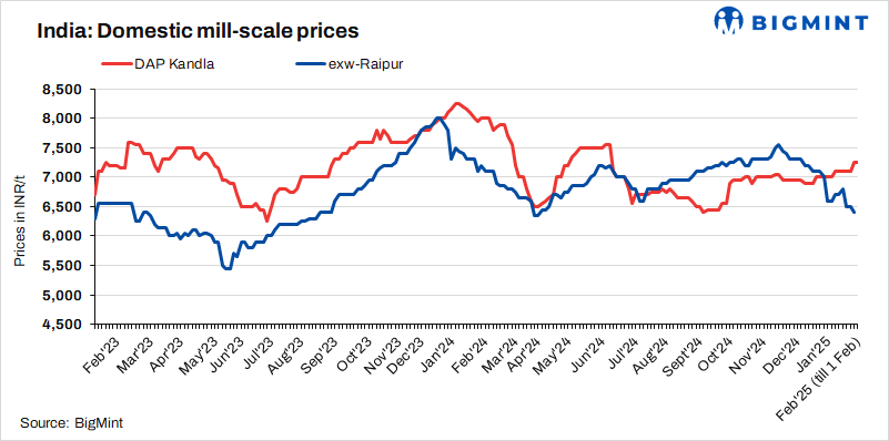 - Prices in Raipur remained unchanged at INR 6,400/t exw today against 29 Jan’25. No deals witnessed amid Lack of demand in the region.
