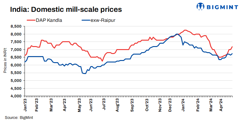 - Mill scale prices in Kandla rose by INR 200/t at INR 7,200/t DAP on 27 Apr’24 against 24 Apr. Deals of 12,000 t were booked at around INR 7,000-7,400/t DAP.