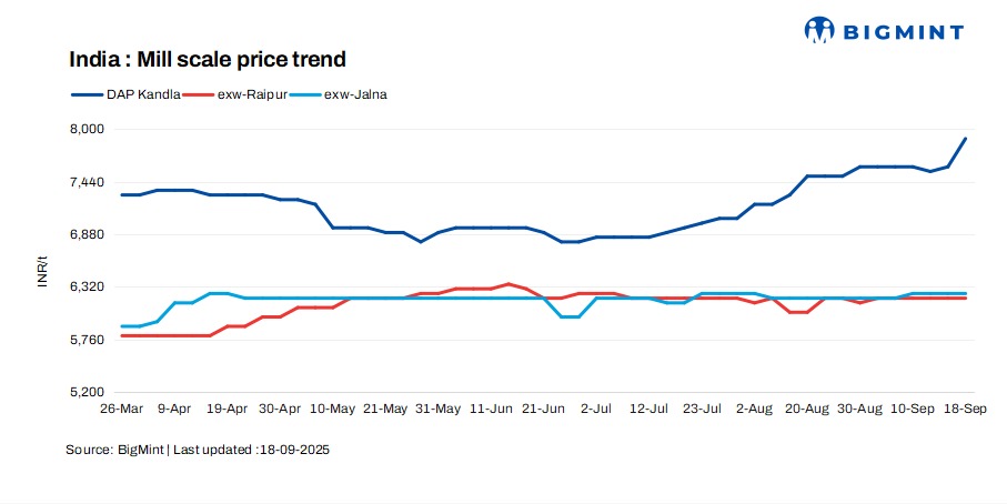 Mill scale (Fe 68-70%) prices in Kandla increased by INR 300/t ($3/t) to INR 7,900/t DAP today. Deals for around 8,700 t were concluded at INR 7,800-8,000/t DAP. Export deals for around 25,000 t were reported by an exporter but are yet to be confirmed. Active demand from exporters, combined with a shortage of materials, drove prices up.