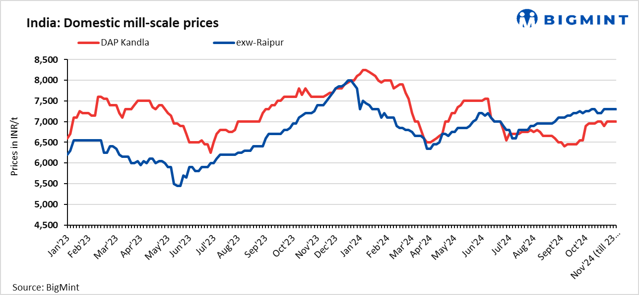 - Prices in Raipur declined by INR 50/t to INR 7,400/t exw today against 20 Nov. Deals of 5,090 t were recorded at higher levels amid bid-offer disparities in the region.