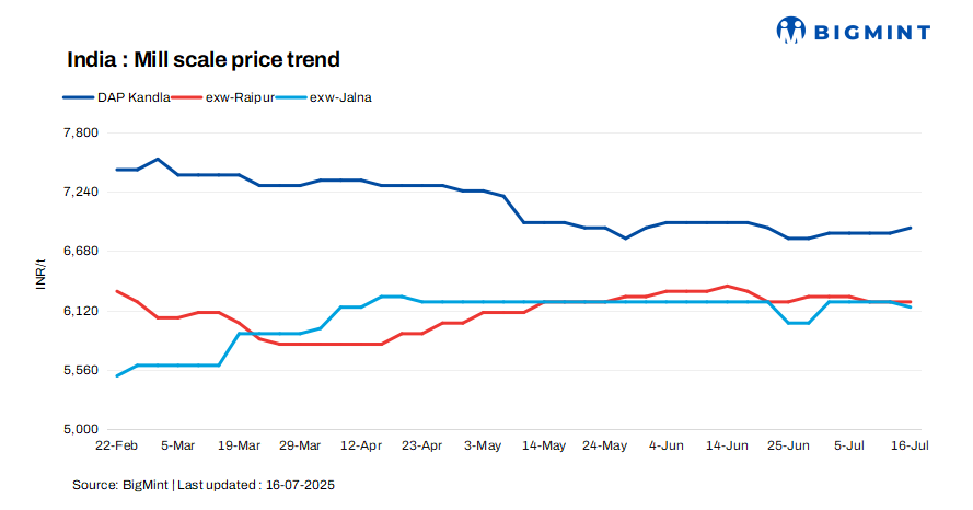 - Raipur: Prices stood firm at INR 6,200/t exw against 12 Jul’25 – 5,100 t traded at INR 6,000-6,550/t exw.