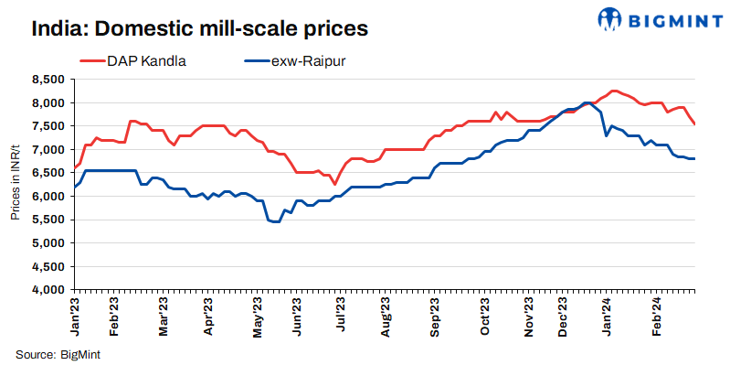 • However, prices in Kandla dropped by INR 150/t to stand at INR 7,550/t DAP today against 21 Feb. However, few deals were concluded at INR 7,300/t DAP.