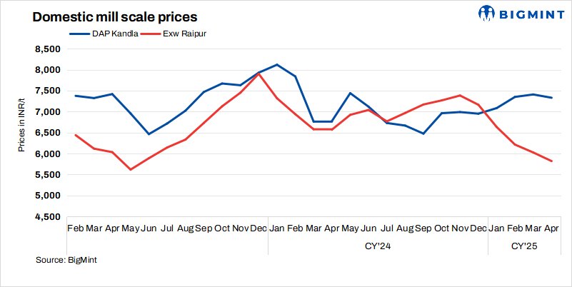 • Raipur prices upped by INR 100/t to INR 5,900/t exw today against 16 Apr’25. Around 12,300 t were traded at INR 6,000-6,500/t. However, sellers resisted lowering offers.