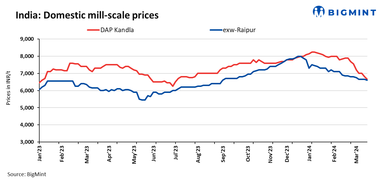 - Mill scale (Fe68-70%) prices in Kandla dropped INR 150/t at INR 6,650/t DAP on 16 Mar’24 as against 13 Mar.