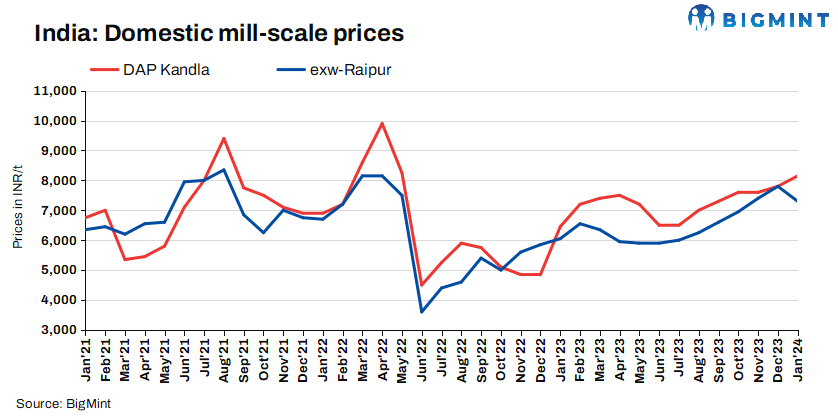 • Raipur mill scale (Fe 68-70%) prices remained stable at INR 7,300/t exw today against 20 Jan. A deal of 600 t mill scale got booked at INR 7,600/t exw Raipur. However limited deal was also heard at INR 6,750/t exw. Bid-offer disparities have weighed on mill scale prices.