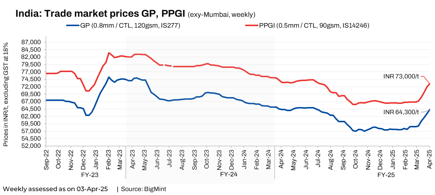 The effective list prices of GP (0.8mm, 80gsm, IS277) stands at around INR 63,500-63,600/t ($741-742/t) ex-Mumbai, while those for PPGI (0.5mm, 90gsm, IS14246) are around INR 73,500-73,750/t ($858-861/t) ex-Mumbai for early April dispatches. Prices mentioned are for coil forms, excluding GST at 18%.