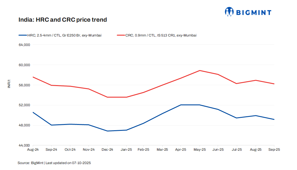 Leading Indian steel manufacturers have decreased the prices of hot-rolled coils (HRCs) and cold-rolled coils (CRCs) by INR 750-1,500/tonne (t) ($8-17/t) for October 2025 sales as compared to the list prices of early-September 2025. However, from the net sales prices of end-September, prices have been raised by around INR 500/t ($6/t) for October 2025.
