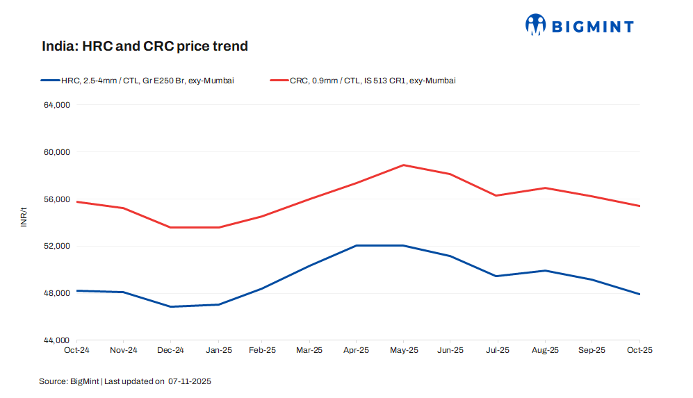 BigMint’s benchmark assessment (bi-weekly) for HRCs (IS2062, Gr E250, 2.5-8 mm/CTL) inched up by INR 200/t ($2/t) w-o-w to INR 47,600/t ($544/t) on 4 November 2025 against INR 47,400 ($546/t) on 28 October 2025. Moreover, CRC (IS513, Gr O, 0.9 mm/CTL) prices rose by INR 500/t ($5/t) w-o-w to INR 55,500/t ($628/t) on Tuesday against INR 55,000/t ($630/t) a week ago. These prices are ex-Mumbai for the distributor-to-dealer segment and exclude 18% GST.