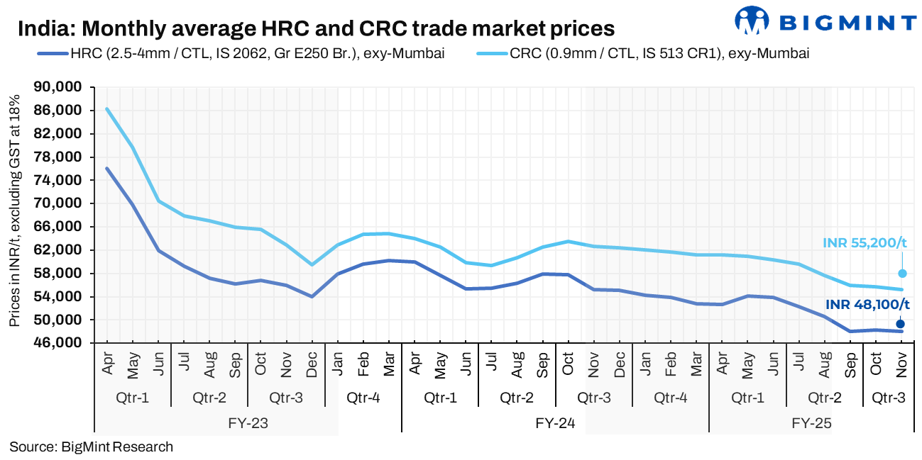 Trade offers discounted against mills’ list prices: Distributors in the traders’ market quoted prices lower than the list prices of the mills amid the limited buying interest amongst end-buyer industries. The trade-level HRC prices reduced by INR 300/t ($4/t) to INR 47,700/t ($563/t) towards end of November compared with the beginning. This was close to the INR 47,000/t ($555/t) seen in early October 2024.