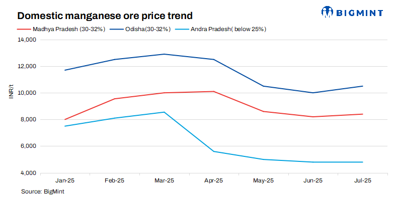 Domestic silico manganese inches up m-o-m: Domestic prices of 60-14 grade silico manganese edged up m-o-m to around INR 71,800/t ($837/t) exw Raipur in June compared to INR 71,200/t ($830/t) in May, as per BigMint’s assessment. In response to oversupply, key smelters strategically reduced production, leading to localised price improvements. These output cuts helped alleviate inventory build-up and brought a measure of stability to the regional silico manganese market, supporting the slight price recovery observed during the month.