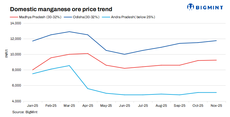 Madhya Pradesh: In Madhya Pradesh, manganese ore grade offers in the 30-32% Mn range saw a modest 1% m-o-m rise in November 2025, largely tracking the price trend set by leading producers.