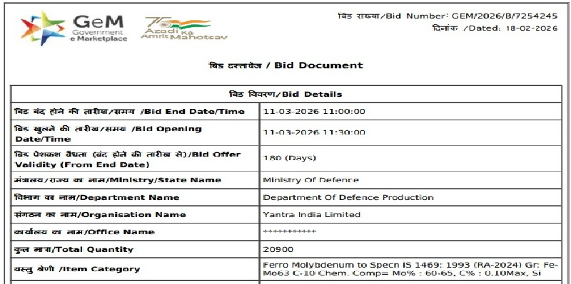The Ministry of Defence has issued a tender to procure 20.9 t of ferro molybdenum (Mo 60-65%, 25-50 mm) for its Yantra India Limited unit. The bid submission deadline is 11 Mar’26, with bid-offers valid for 180 days from the closing date. BigMint assessed ferro molybdenum (Mo: 60%, 10-100 mm) prices at INR 3,760,000/t ($41,282/t) exw on 18 Feb’26.