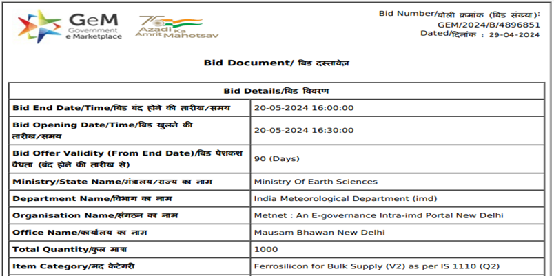 Ministry of Earth Sciences (MoES) has invited bids for procurement of 1,000 t of ferro silicon (Si: 50-75%, 25- 150 mm) for its Metnet (an e-Governance Intra-IMD Portal, New Delhi). The last date for bid submission is 20 May’24 and the bid offer is valid for 90 days from the last date.