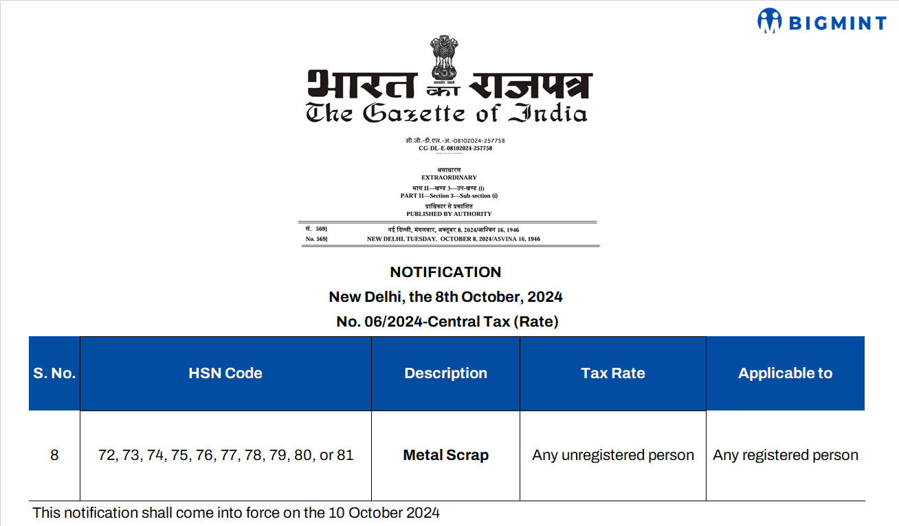 On 8 October 2024, the Indian government announced a series of notifications amending the Goods and Services Tax (GST) regulations, specifically for metal scrap.