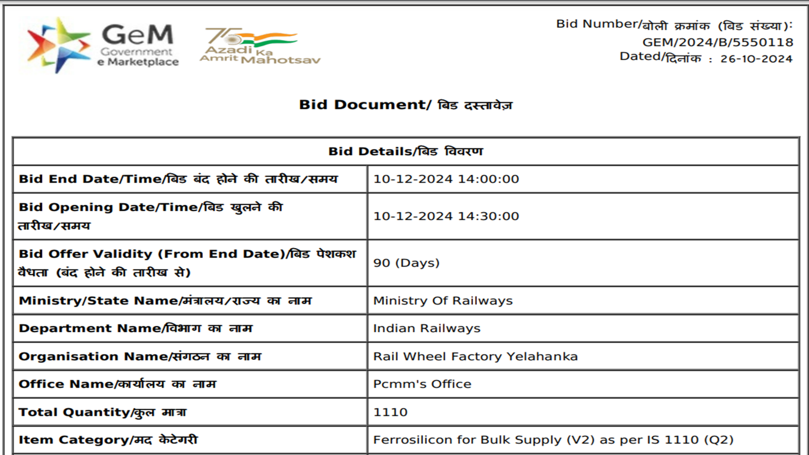 The Ministry of Railways has invited bids for procurement of 1,110 t of ferro silicon (Si: 70-75%, 25-70 mm) for its Rail Wheel Factory in Yelahanka. The last date for bid submission is 10 Dec’24. The highest-priced bid elimination is applicable for the reverse auction qualification rule.