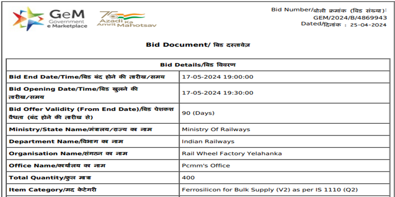Ministry of railways has invited bids for procurement of 400 t of ferro silicon (Si: 70-75%, 25- 70 mm) for its Rail Wheel Factory Yelahanka Plant based out at Karnataka. The last date for bid submission is 17 May’24 and the bid offer is valid for 90 days from the last date. The delivery of material is scheduled within 120 days from the date of purchase order.