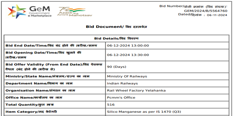 India’s Ministry of Railways has invited bids for the procurement of 516 t of silico manganese (Mn: 60%, 25-100 mm) for its Rail Wheel Factory in Yelahanka. The last date for bid submission is 6 Dec’24. Highest-priced bid elimination is applicable for the reverse auction qualification rule.