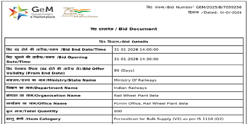 The Ministry of Railways has issued a tender to procure 800 t of ferro silicon (Si: 70-75%, 25-70 mm) for its Rail Wheel Plant, Bela unit. The bid submission deadline is 31 Jan’26, with bid-offer valid for 90 days from the end date. Material delivery is scheduled within 280 days from the purchase order date.