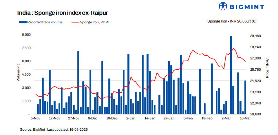Indian sponge iron prices displayed a mixed trend across regions today. Prices increased by up to INR 400/t in the Chennai market, while the Jharsugda region witnessed a decline of up to INR 400/t. Prices in Raipur were largely stable. Buying activity remained moderate across markets.