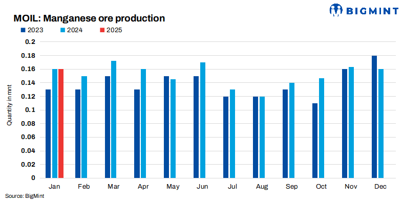 MOIL’s manganese ore production in the first ten months of FY’25 (Apr-Jan’25) touched 1.49 mnt, reflecting a 4% y-o-y growth. Additionally, sales totalled 1.29 mnt during this period, a 5% increase from the previous year. In Jan’25, the company maintained production at 0.16 mnt, showing no change compared to Jan’24.