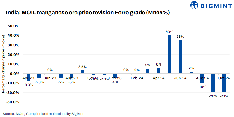 India’s leading manganese ore producer, MOIL, has announced new prices, effective 1 October 2024. Manganese ore grades above 44% will face a price cut of 20%, while grades below 44%, including SMGR and fines, will see 5% hike.