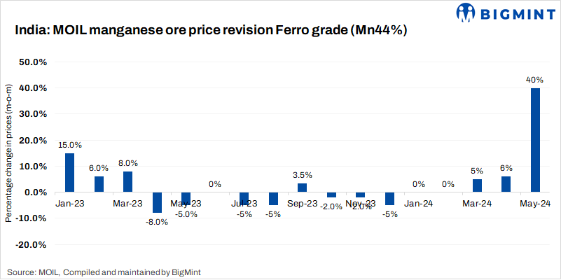 MOIL has increased manganese ore prices today for May’24. Mn grades above 44% have winessed a 40% growth in offers m-o-m, while lumps below 44% have increased by 25%, BigMint learned.