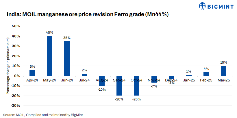 MOIL, an Indian state-owned mining company, has increased offers for manganese ore effective 1 March 2025. For manganese grades above Mn44%, prices have been raised by 10% and below Mn44% grade prices have been hiked by 6.5% m-o-m, BigMint learnt from sources. Meanwhile, tags of all SMGR (Mn 30%, Mn 25%, and Mn 20%) are rolled over and fines grades sees appreciation by 6.5%.