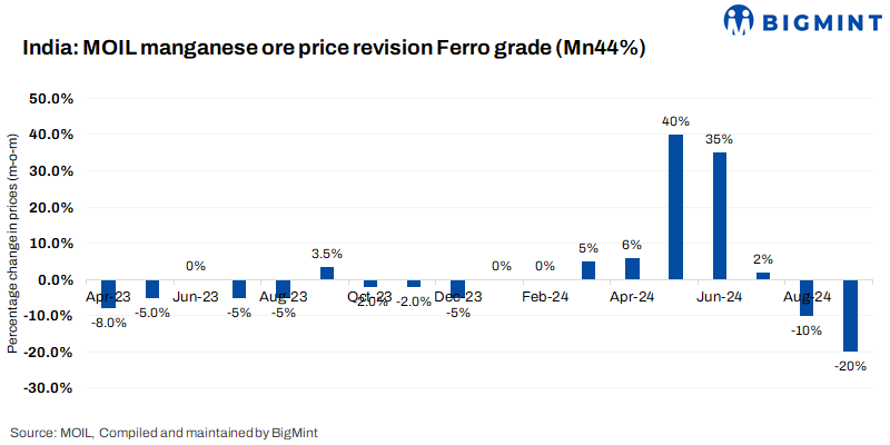 MOIL, India’s leading manganese ore producer, announced new prices starting September 1, 2024. Manganese ore with grades above 44% saw a 20% price reduction, while grades below 44%, including SMGR and fines, experienced a 15% decrease.