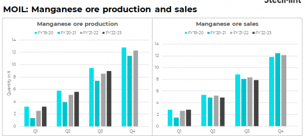 In December 2022, MOIL produced 1,41,321 tonnes of manganese ore, which was a new record. Over November, 2022, production increased by 18% at its rated capacity level. - Sales fall by 6% y-o-y