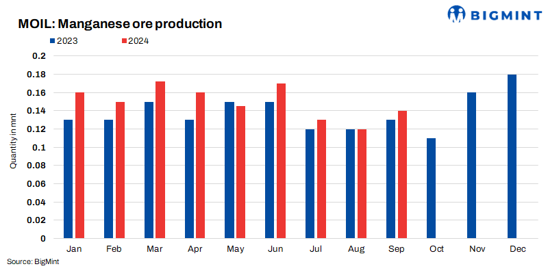 MOIL achieved its highest-ever September manganese ore production of 0.14 mnt in 2024, continuing its growth momentum. The company produced 0.87 mnt in H1FY’25, marking a 7% growth over the corresponding period last year. It also recorded its best-ever September sales at 0.15 mnt. In H1FY’25, sales remained steady y-o-y at 0.75 mnt despite challenging market conditions.